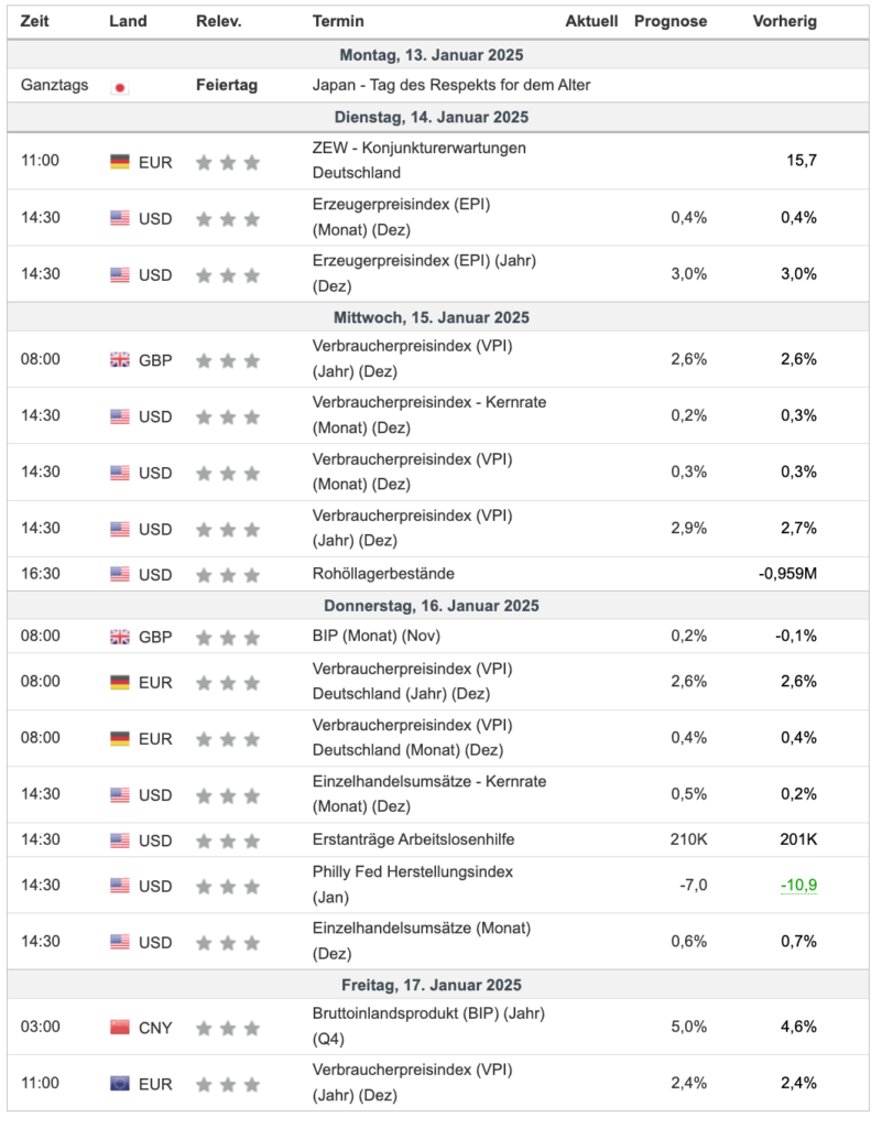Nächste Woche wird spannend, besonders für Trader, die ein Auge auf die großen Wirtschaftstrends haben. Im Mittelpunkt stehen die Inflationszahlen, die entscheidende Hinweise auf die künftige Geldpolitik der Zentralbanken liefern könnten. Hier sind die wichtigsten Termine, die ihr im Blick behalten solltet: