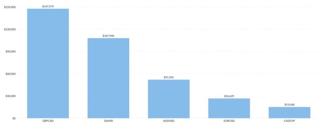 Die nächsten beiden Grafiken stammen von The 5%ers, die auf ihrem Blog regelmäßig spannende Einblicke in die beliebtesten Instrumente der Community teilen. Ganz vorne dabei? In der letzten Woche waren es: Gold, EURUSD und BTCUSD.