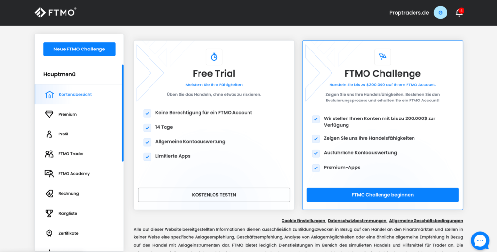 Bei FTMO bekommst Du ein kostenfreies Demokonto, um das Trading erstmal risikofrei kennenzulernen