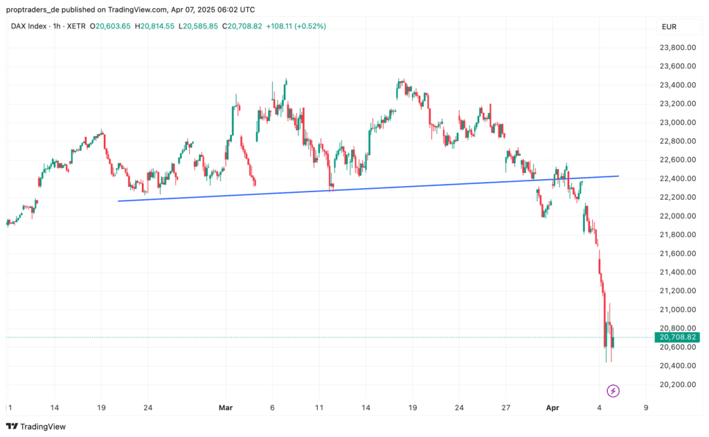 Nachdem die Aufwärtstrendlinie im Bereich um 22.400 Punkte klar gebrochen wurde, war der Weg nach unten quasi freigeräumt. Der Markt hat nicht mal versucht, sich zu stabilisieren – es ging einfach kerzengerade runter. Innerhalb weniger Sessions rauschte der DAX auf unter 20.600 Punkte, ein technischer Knockout erster Klasse. Klassischer Fall von: Support gebrochen, Käufer ausgestiegen, Panik übernahm das Steuer. Wer hier Short war, hat gefeiert – alle anderen? Naja, hoffen gerade auf eine Bodenbildung.